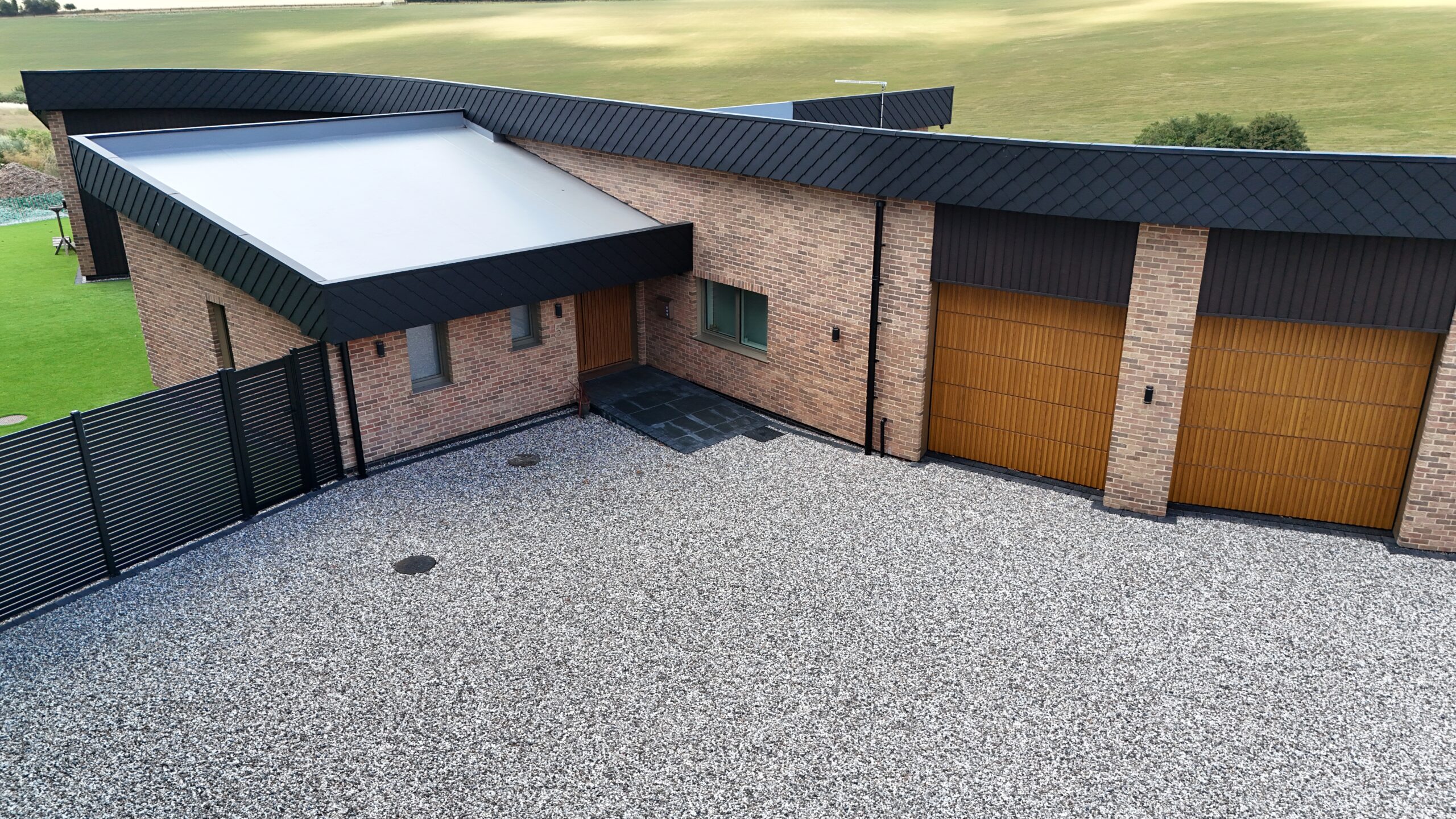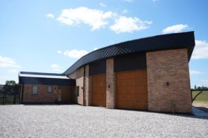 Located on Plot 5 of a five-home development in Hertfordshire, Doone Brae Farm is a one-of-a-kind, architecturally ambitious home is the largest and most technically advanced in the group. Designed to reflect the client’s commitment to sustainability and off-grid living, it blends bold architectural form with exceptional environmental performance — achieved in close collaboration with Lowfield Timber Frames.