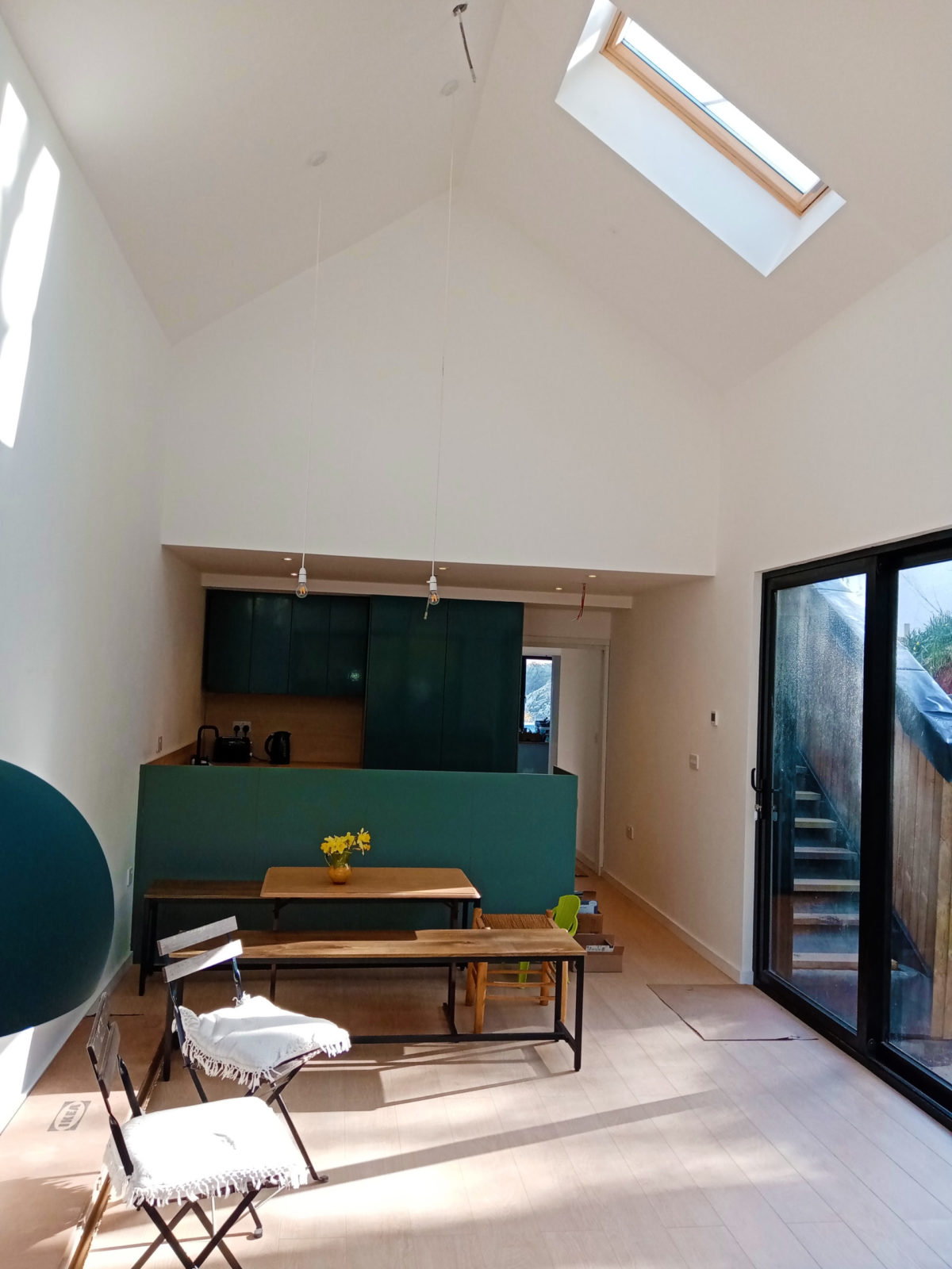 Our Shropshire based client chose Lowfield Timber Frames to supply and erect the frame for their beautiful holiday home in Amlwch in Anglesey. The 100m2 building is an open plan two storey minimalist design which utilises maximum natural light via full height frontal glazing and roof lights throughout. Although the plot may be small, the build design has maximised the buildings grandeur creating a bright and airy oasis to enjoy.