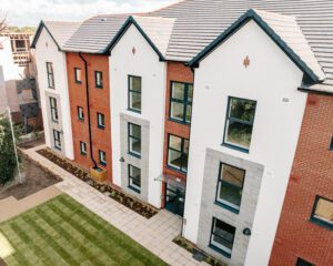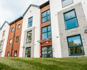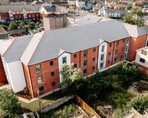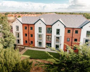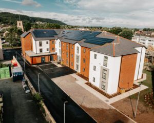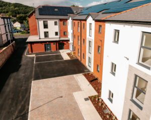 The Llys Onnen development delivers 43 one- and two-bedroom apartments on a brownfield site in Abergele. The three-storey buildings use timber frame construction. The scheme meets EPC A standards and focuses on sustainability, efficiency, and modern living.