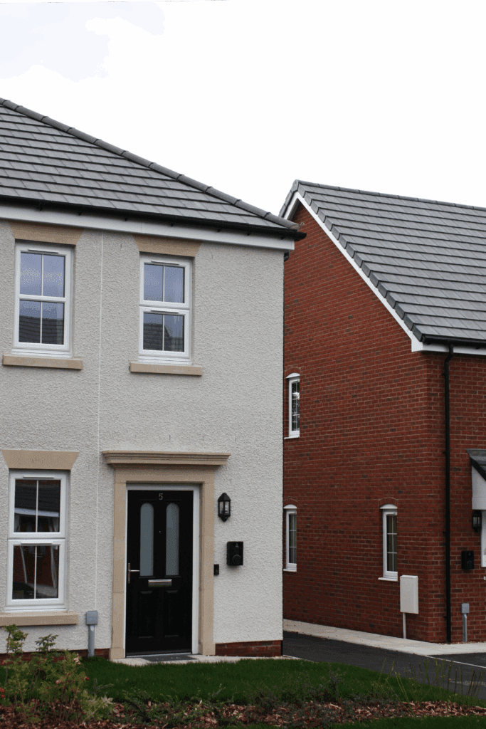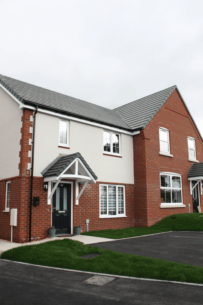 SJ Roberts Construction Ltd built the homes using timber frame, while red brick, render, and rumbled limestone complement the surrounding village architecture. Design details, including brick quoins and arched rowlock window heads, reflect the local vernacular.