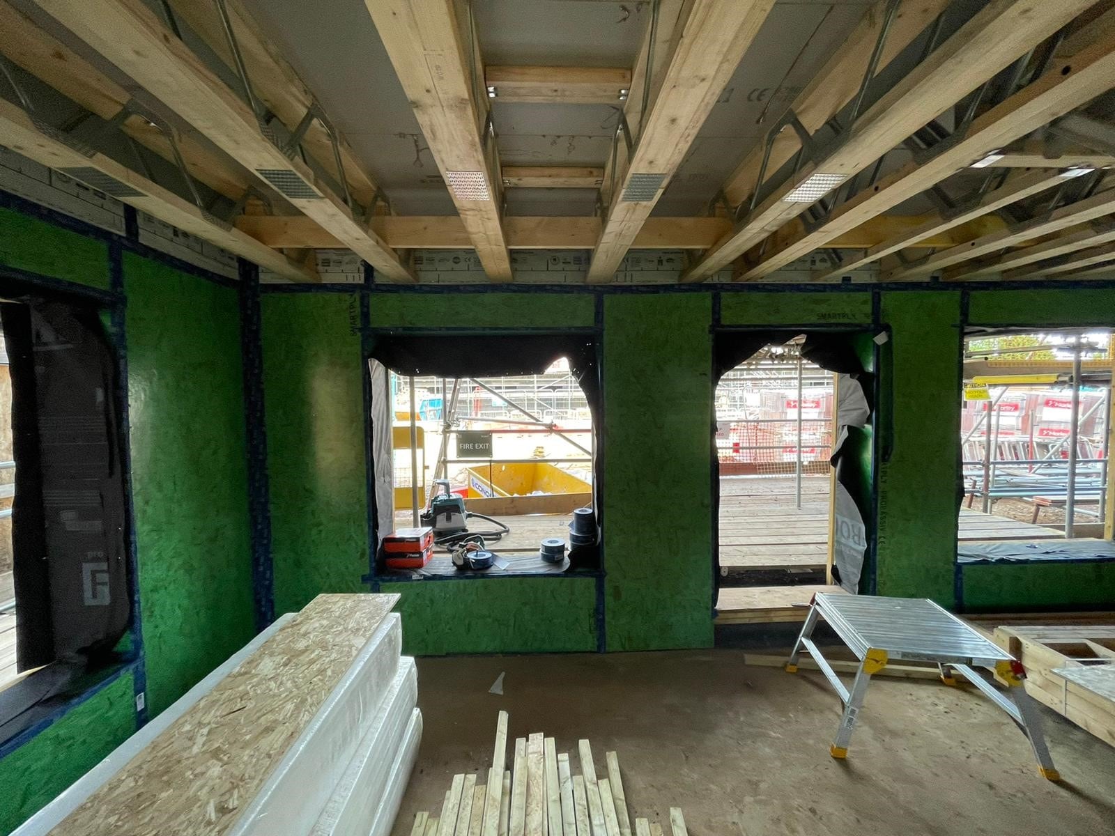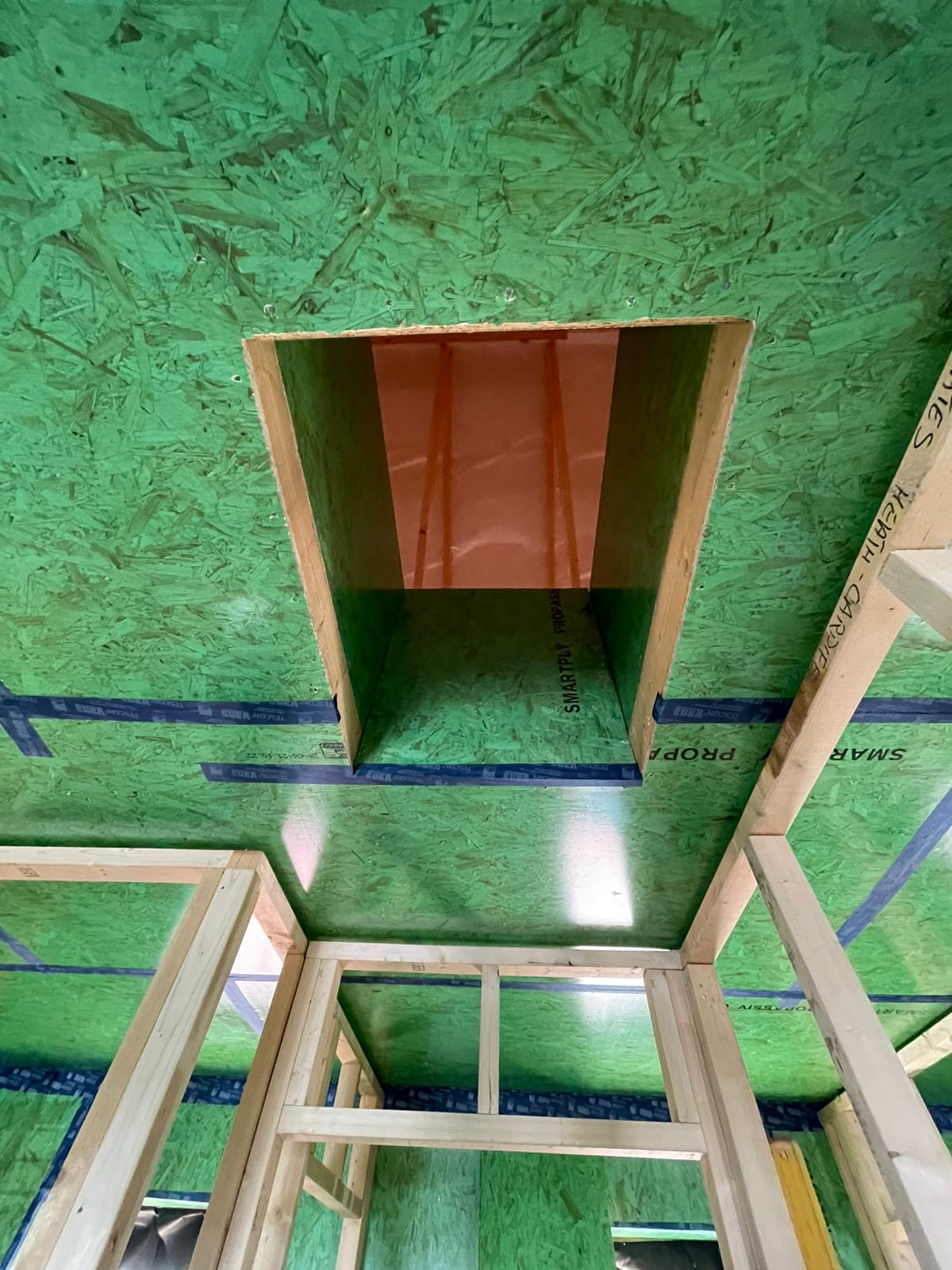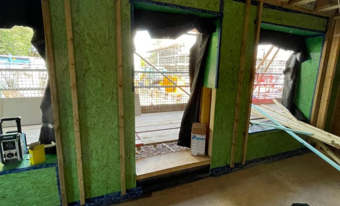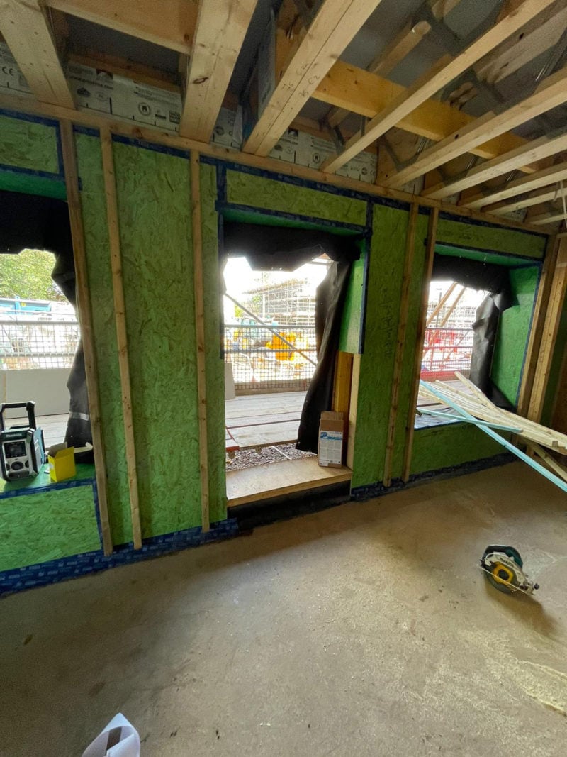 A hole is cut in the internal airtightness layer and the insulation is pumped into the wall cavity, then the hole is sealed with airtight tape. The airtight tape is imperative. It should be used on all internal joints and around window and door openings. The tape can also be used on the external membrane joints to aid wind tightness. Roof cassettes can also be used which are filled the same way as the wall panels.