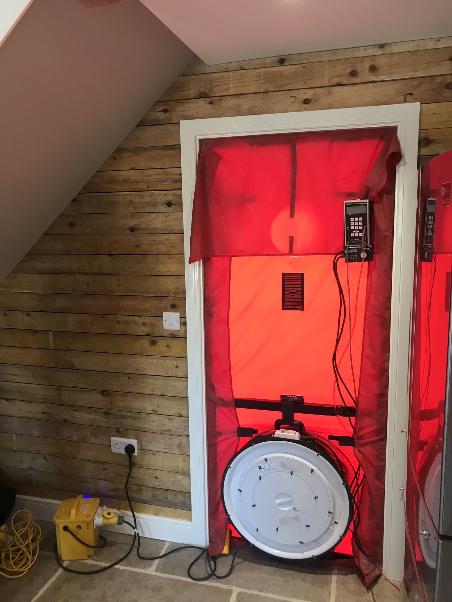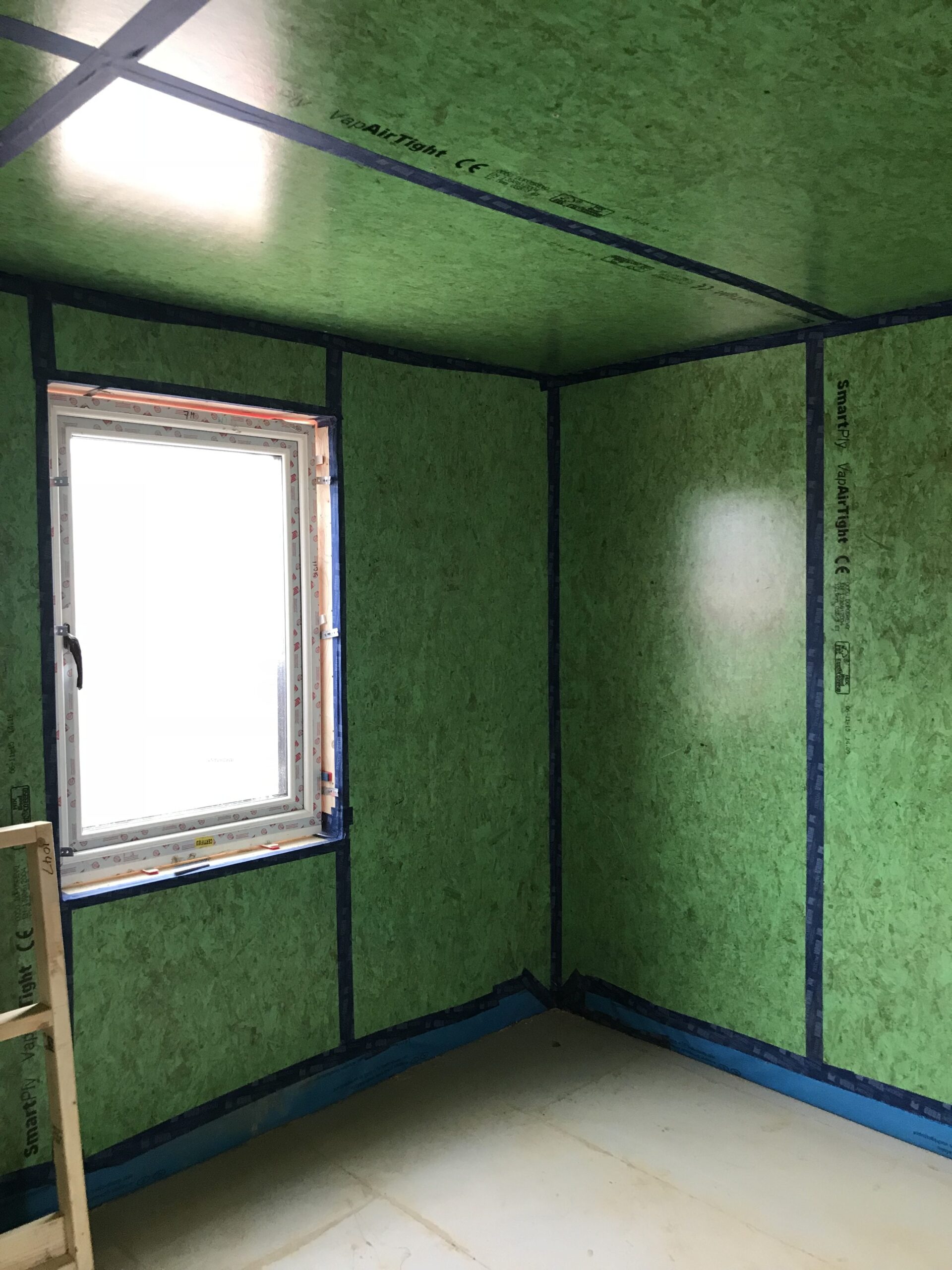 Airtightness is the sealing of the building. This is to ensure that no heat escapes and there are no draughts or cold air leaks. A conventional building can have up to 7 air changes per hour (ACH), Passivhaus must be 0.6 (ACH) or less at 50 pascals of pressure. Airtightness is measured via a blower door test.